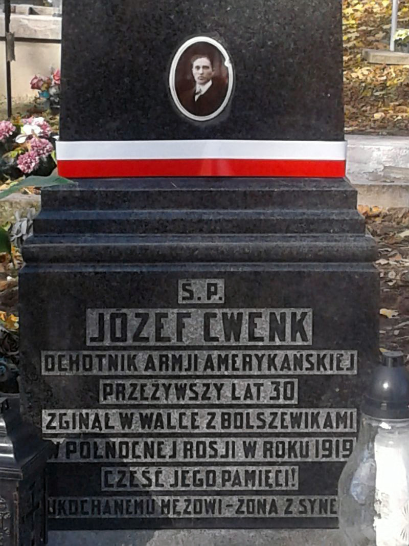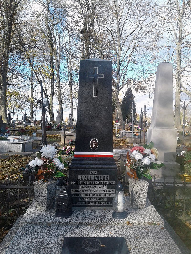 Zdjęcie wykonano w 1930 roku w dniu pogrzebu Józefa Cwenka - żołnierza (ochotnika) armii amerykańskiej, który poległ w walce z bolszewikami w północnej Rosji w 1919 r. i ma swój grób na miejscowym cmentarzu.