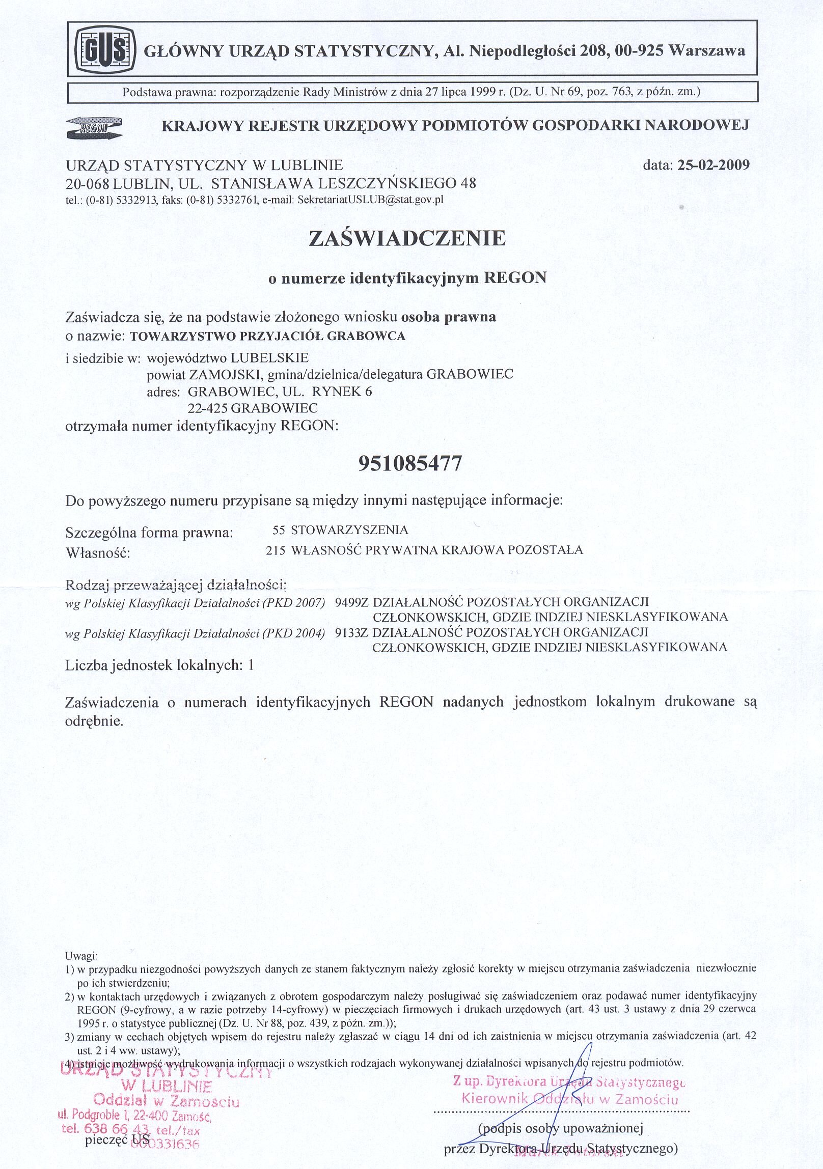 | KRAJOWY REJESTR URZĘDOWY PODMIOTÓW GOSPODARKI NARODOWEJ URZĄD STATYSTYCZNY W LUBLINIE data: 25-02-2009 20-068 LUBLIN, UL. STANISŁAWA LESZCZYŃSKIEGO 48 tel.: (0-81) 5332913, faks: (0-81) 5332761, e-mail: SekretariatUSLUB@stat.gov.pl ZAŚWIADCZENIE o numerze identyfikacyjnym REGON Zaświadcza się, że na podstawie złożonego wniosku osoba prawna O nazwie: TOWARZYSTWO PRZYJACIÓŁ GRABOWCA i siedzibie w: województwo LUBELSKIE powiat ZAMOJSKI, gmina/dzielnica/delegatura GRABOWIEC adres: GRABOWIEC, UL. RYNEK 6 22-425 GRABOWIEC otrzymała numer identyfikacyjny REGON: 951085477 Do powyższego numeru przypisane są między innymi następujące informacje: Szczególna forma prawna: 55 STOWARZYSZENIA Własność: 2'5 WŁASNOŚĆ PRYWATNA KRAJOWA POZOSTAŁA Rodzaj przeważającej działalności: wg Polskiej Klasyfikacji Działalności (PKD 2007) 9499Z DZIAŁALNOŚĆ POZOSTAŁYCH ORGANIZACJI CZŁONKOWSKICH, GDZIE INDZIEJ NIESKLASYFIKOWANA wg Polskiej Klasyfikacji Działalności (PKD 2004) 9133Z DZIAŁALNOŚĆ POZOSTAŁYCH ORGANIZACJI CZŁONKOWSKICH, GDZIE INDZIEJ NIESKLASYFIKOWANA Liczba jednostek lokalnych: 1 Zaświadczenia o numerach identyfikacyjnych REGON nadanych jednostkom lokalnym drukowane są odrębnie. |